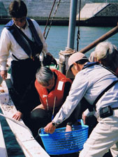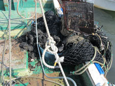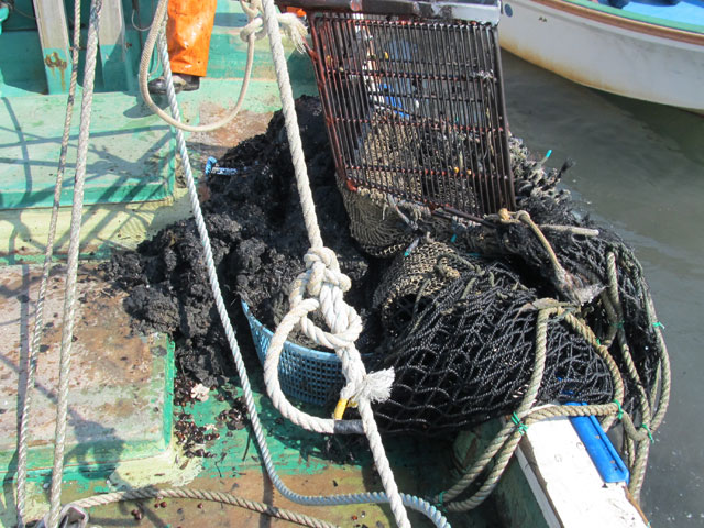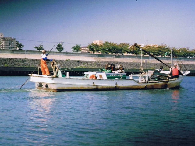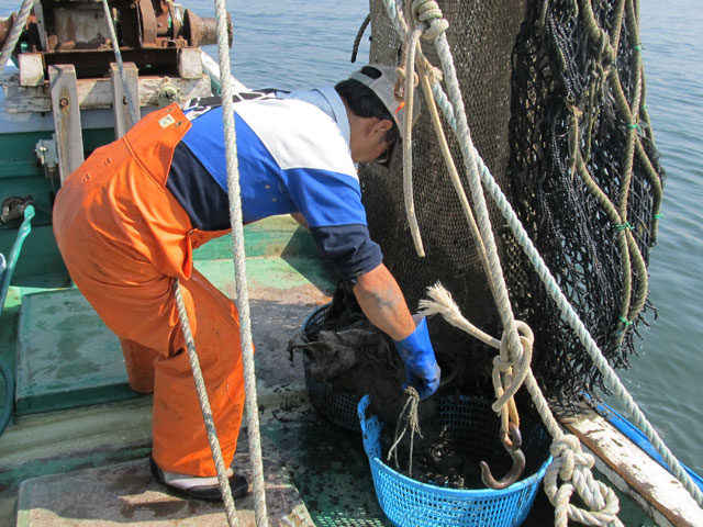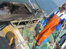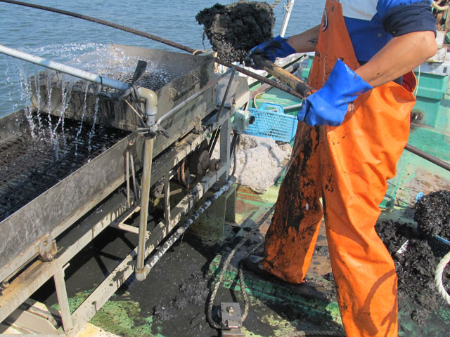 鋤簾にヘドロが入りすぎたため、ヘドロを抜く作業をおこなった後、船に上げ、“ヤマトしじみ”を取り出しました。