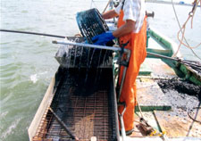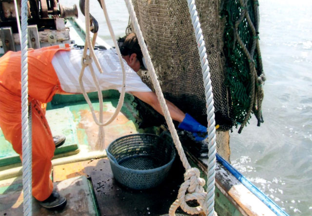 鋤簾(じょれん)から採れたしじみを船に上げている。 |